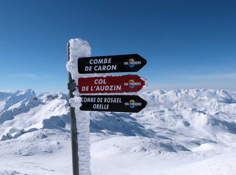 Lyžařské město Val Thorens se sjezdovkami místo ulic - do ubytka se téměř vždy dostanete na lyžích - nabízí sněhovou jistotu po celou sezónu, díky svému položení ve 2 300 m n. m. a severní orientaci většiny svahů. Ze nepříznivých povětrnostních podmínek je však potřeba sjet do nižších částí střediska, jelikož zde není jediná trať chráněná porostem. Za vyzkoušení rozhodně stojí visutá kabinová lanovka vedoucí na Cime de Caron - 3.195 m n. m., která nabízí jeden z nejhezčích výhledů na celé panorama francouzských Alp s masivy Mont Blanc, Vanoise, Grandes Rousses či Écrins, ale při dobré viditelnosti i na Alpy švýcarské a italské.