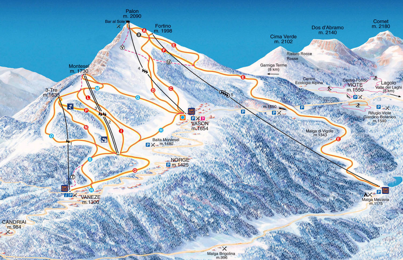 V Monte Bondone na vás čeká přes 6 km modrých sjezdovek, téměř 15 km červených a k tomu něco málo přes jeden kilometr dlouhé černé sjezdovky. Ryze modrá a vyloženě lehoučká sjezdovka pro začátečníky je "cesta" spojující vesničky Vason a Veneze. Ostatní sjezdovky mají červený nádech, a tak jsou zábavné nejen pro dětičky, ale také pro jejich doprovod.