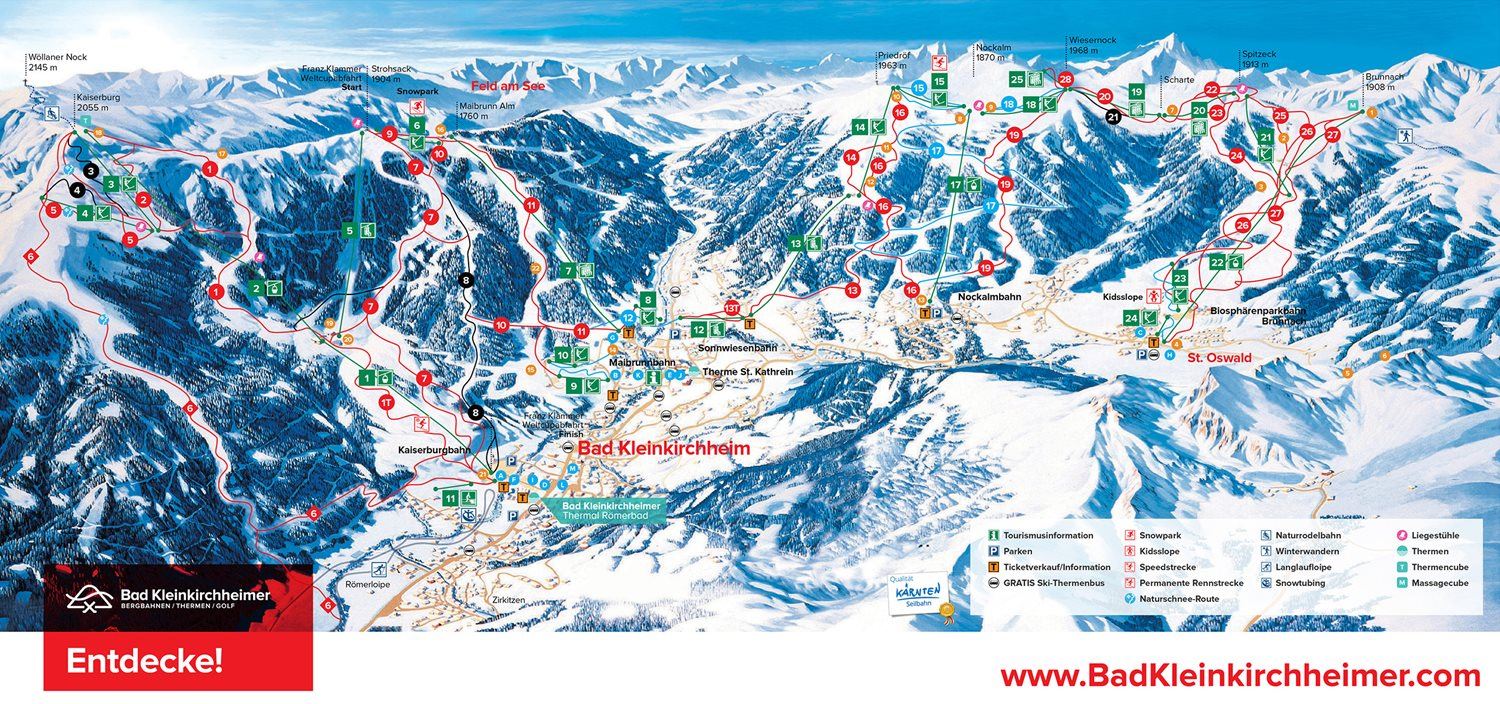 V Bad Klienkirchheim najdete celkem 103 km sjezdovek. Dominují mezi nimi především svižné, červené sjezdovky. Celý areál se rozprostírá na dvou horských hřbetech - středisko je situováno v údolí mezi nimi. Svahy z vrcholů Kaiserburg a Strohsac jsou severně orientované a nabízí především červené sjezdovky, které se klikatí v lesních průsecích. Protilehlý vrchol Nockalm poskytuje na své náhorní planině mírné, modré sjezdovky, ideální pro nejmladší lyžaře. Zajímavé a lyžařsky pestré jsou i sjezdovky v části St. Oswald, které lemují trasu moderní kabinkové lanovky.